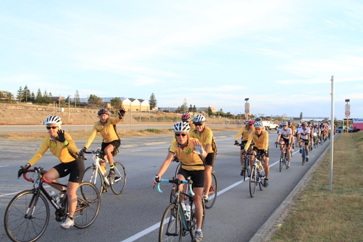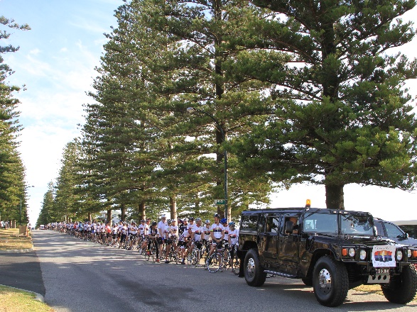 Following the police vehicle was Ray Hunt in his giant Hummer decorated with Tim’s Ride banners. The immense peloton stretched over a kilometre and was followed by the support vehicles ( PIHC Medical driver Ian Wee , Parker Cycles Breakd own – Dennis Lightfoot and Budget Sweeper Vehicle driven by Di Beveridge ).