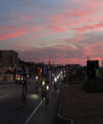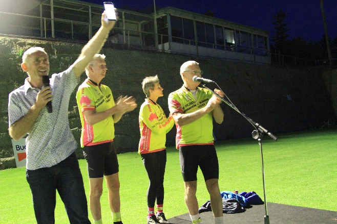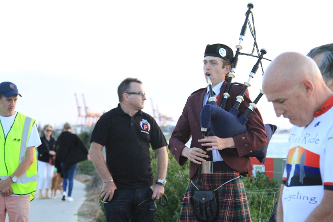 He thanked the wonderful supporters and riders for their participation . He talked about the aim of the ride to increase cycling safety so other families might not have to suffer. As the sun set Scotch College Pipe Major Dylan Flecker played the beautiful lament “Flowers of the Forest.” Then Assistant Commissioner Nick Anticich spoke about difficulties faced by police in their day to day role. He strongly supported their role in promoting increased cycling safety. James Sutherland then invited everyone to resume their cycling journey back to the finish at Harvey Field.