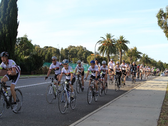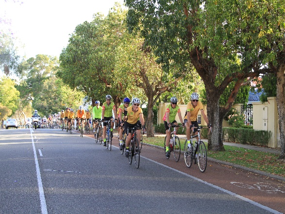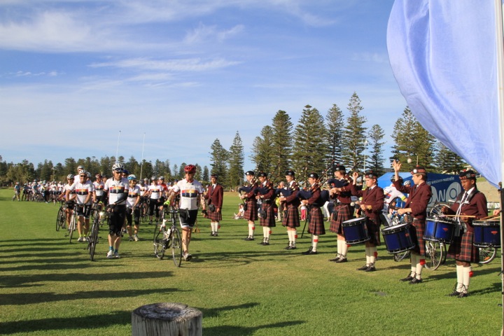The final briefing and safety instructions for the Peloton were given by Cycling Coordinator Peter Trench and Sergeant Simon Baxter who included a description of the Green Light corridor that would be created and how the riders would be protected by the surrounding Police Cars and Motorcycles. The peloton ride departed soon after with riders passing through a guard of honour and stirring music supplied by the Scotch College Pipe Band as they pass ed under the Bicycling WA Banner before walking around the corner to assemble in Broome Street.